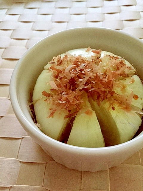 電子レンジで簡単一品 丸ごと玉ねぎのおかかのせ レシピ 食べ物のアイデア 玉ねぎ レシピ